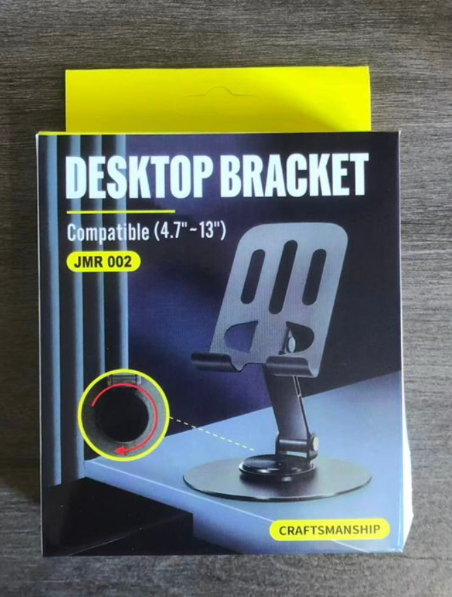 The JMR-002 Desktop Bracket Stand is a sturdy and versatile holder designed to securely support smartphones, tablets, or other devices on your desk. With adjustable angles and a stable base, it provides a comfortable hands-free viewing experience for video calls, media streaming, or work. Its sleek, ergonomic design makes it perfect for home, office, or study setups.
